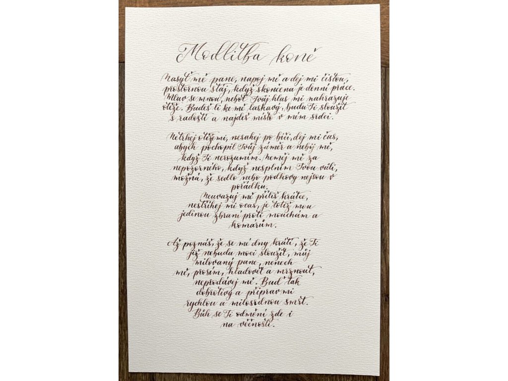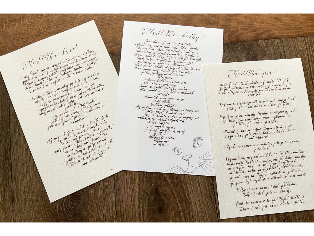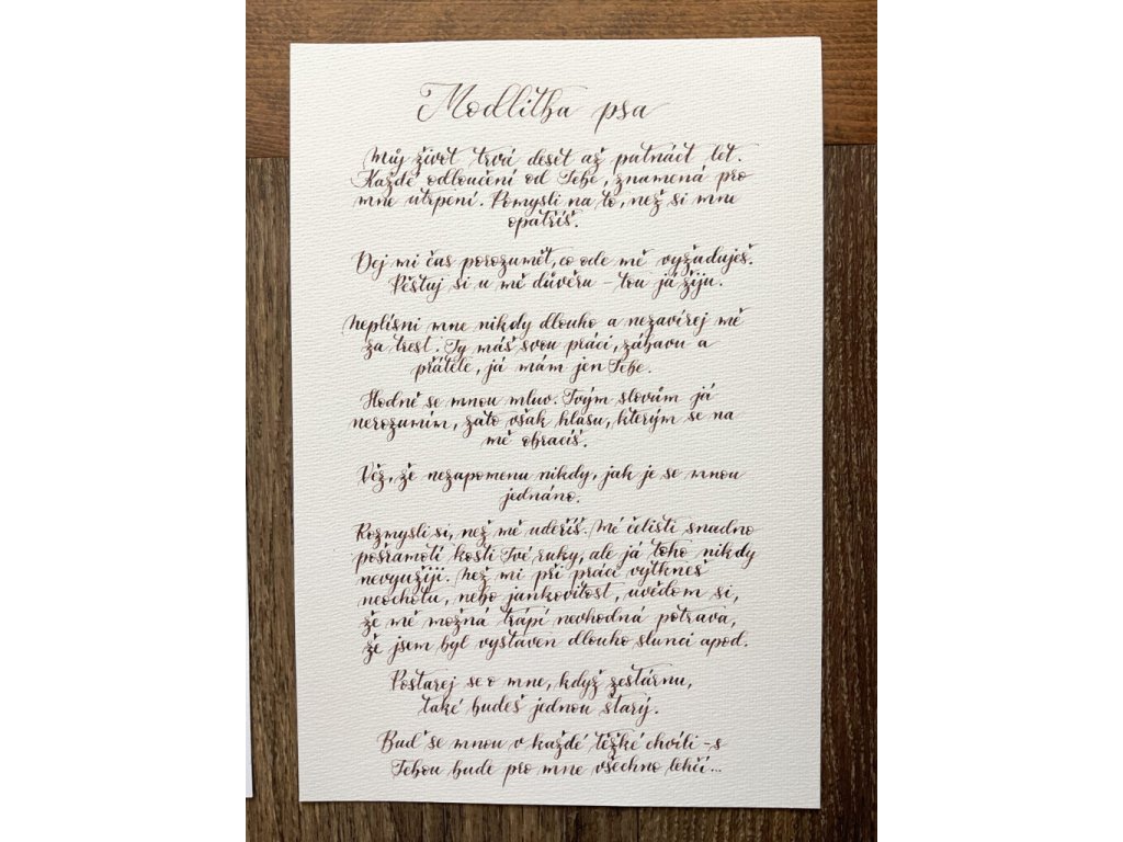Ručně psaný kaligrafický text „Modlitby“ věnované psovi, kočce nebo koni přináší krásné a dojemné vyznání, které můžete zarámovat a mít stále na očích.