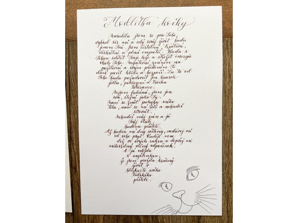 Kaligrafická Modlitba pro kočku, psa nebo koně – ručně psaný text pro milovníky zvířat